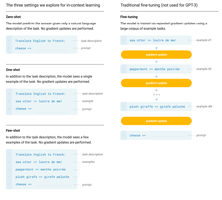 Figure 2.1 : How gpt3 is trained with zero-shot, one-shot, few-shot settings: