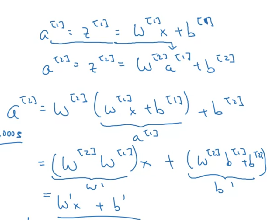 - Linear activation function’ı 1 case hariç hiçbir yerde activation function olarak kullanmıyoruz çünkü linear activation function öğrenememeye sebep oluyor. Here is why: