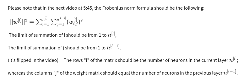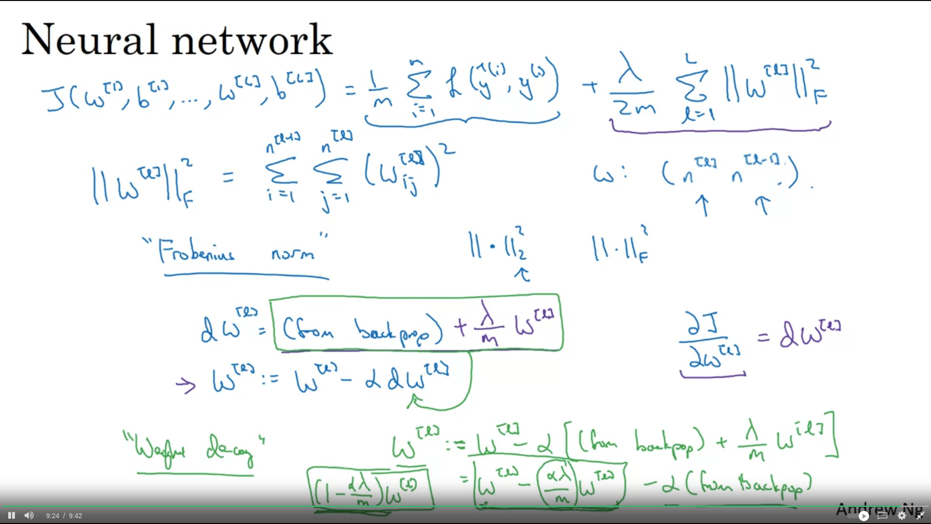 How does regularization prevents overfitting lambdanın değerine göre (gerçekten büyük olması durumunda) w weight matrix i daha fazla 0 a yakın değerler içermeye başlıyor. Bu neural networkte bazı değrleri sıfırlıyor yani aynı layer sayısında ama her layerda daha az feature olan bir neural networkle karşılaşıyoruz. Daha simple bir neural networkü traşn ediyor gibi oluyoruz.