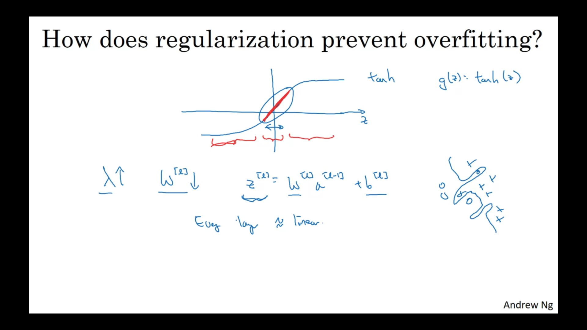 When lambda is big → W will be small → Z will be relatively small → small z values end up being nearly linear for tanh function → in the linear case overfitting will be prevented