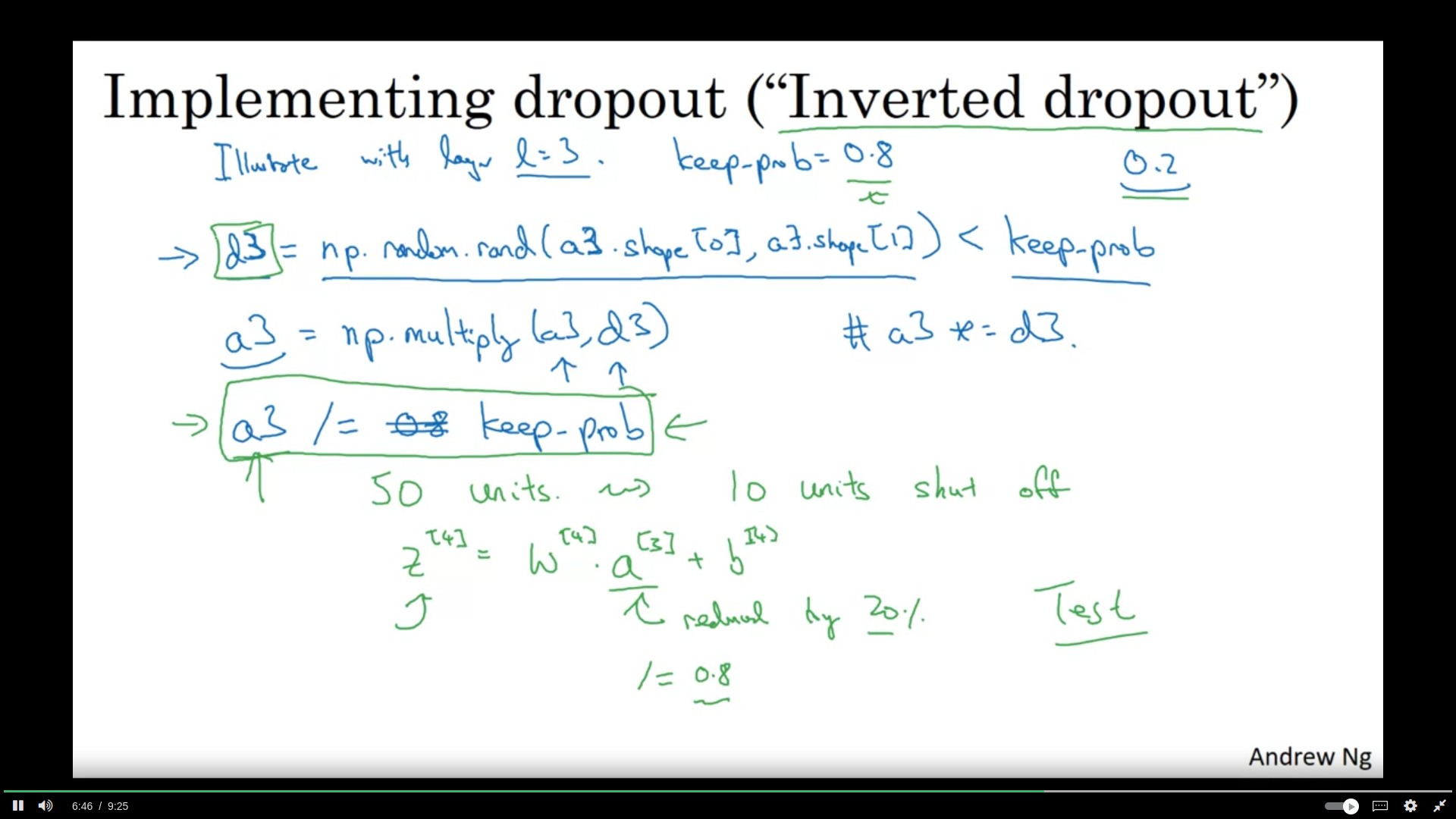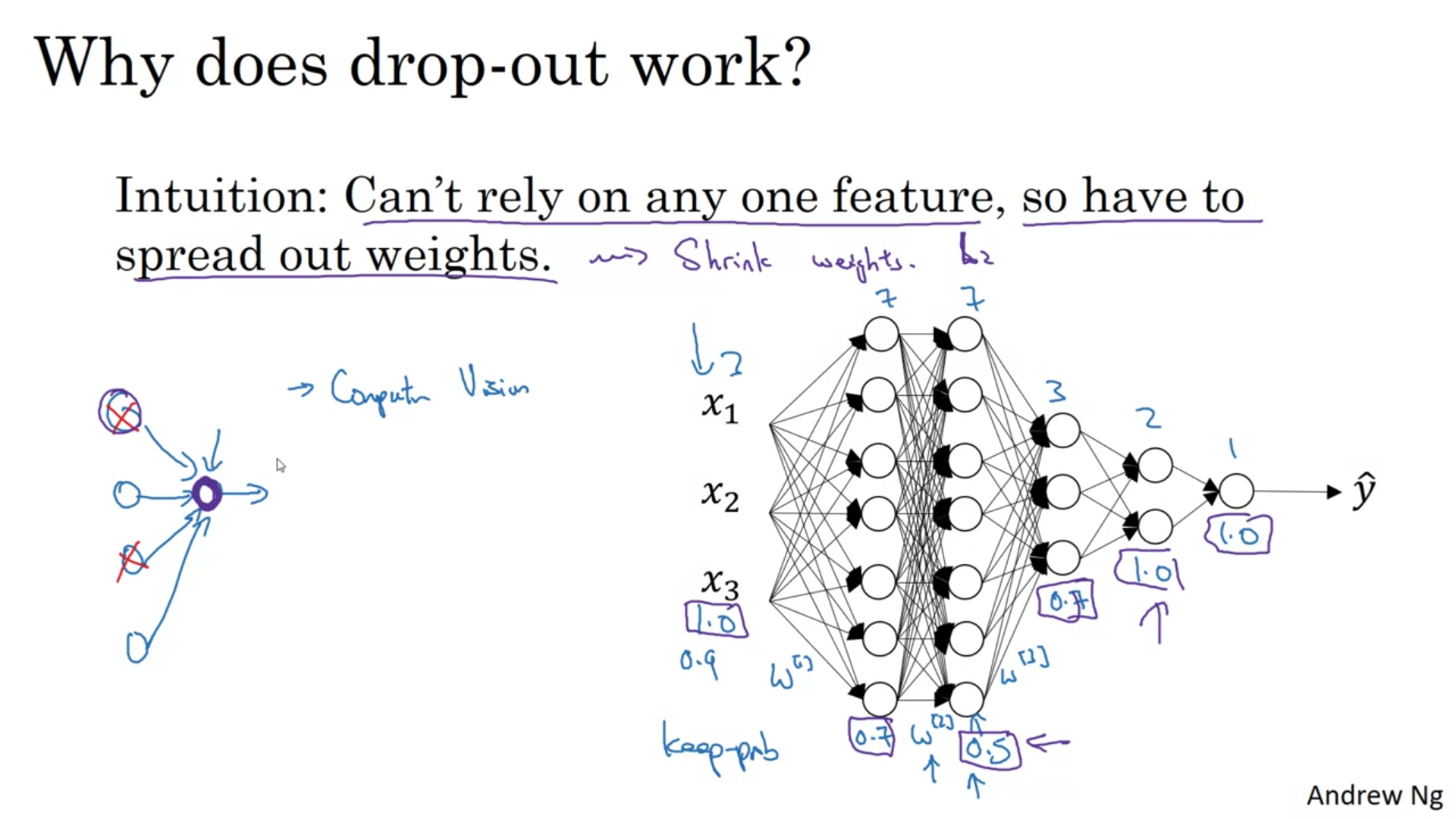 With dropout inputs can be eliminated. yani o node a gelen inputlardan herhangi birine daha fazla odaklanmasını engelliyor ve weighti daha iyi dağıtabiliyor.