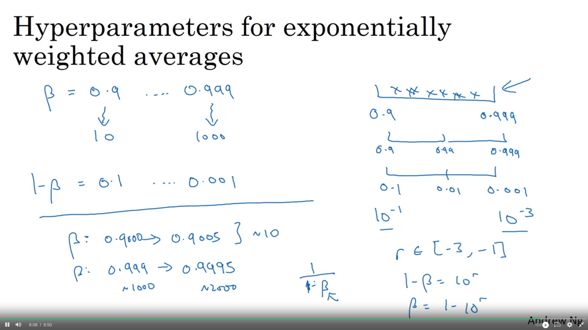 Aynı şekilde burada da beta değerinin 0.9 olması ile 0.999 olması arasında çok fark var. 0.9 olması son 10 günlük averagea bakılıyor olması anlamına gelirken 0.999 olması son 1000 günlük average a bakılıyor olmasına denk. Bu durumda 1 - beta üzerinden logaritmik bir randomization uygulanmalı.