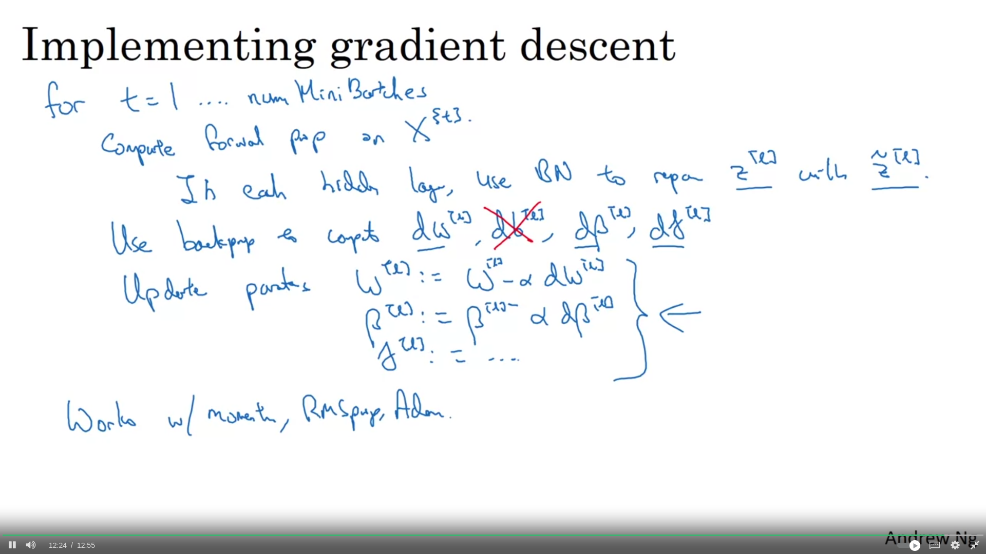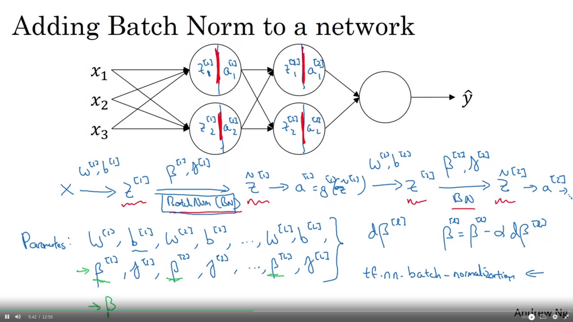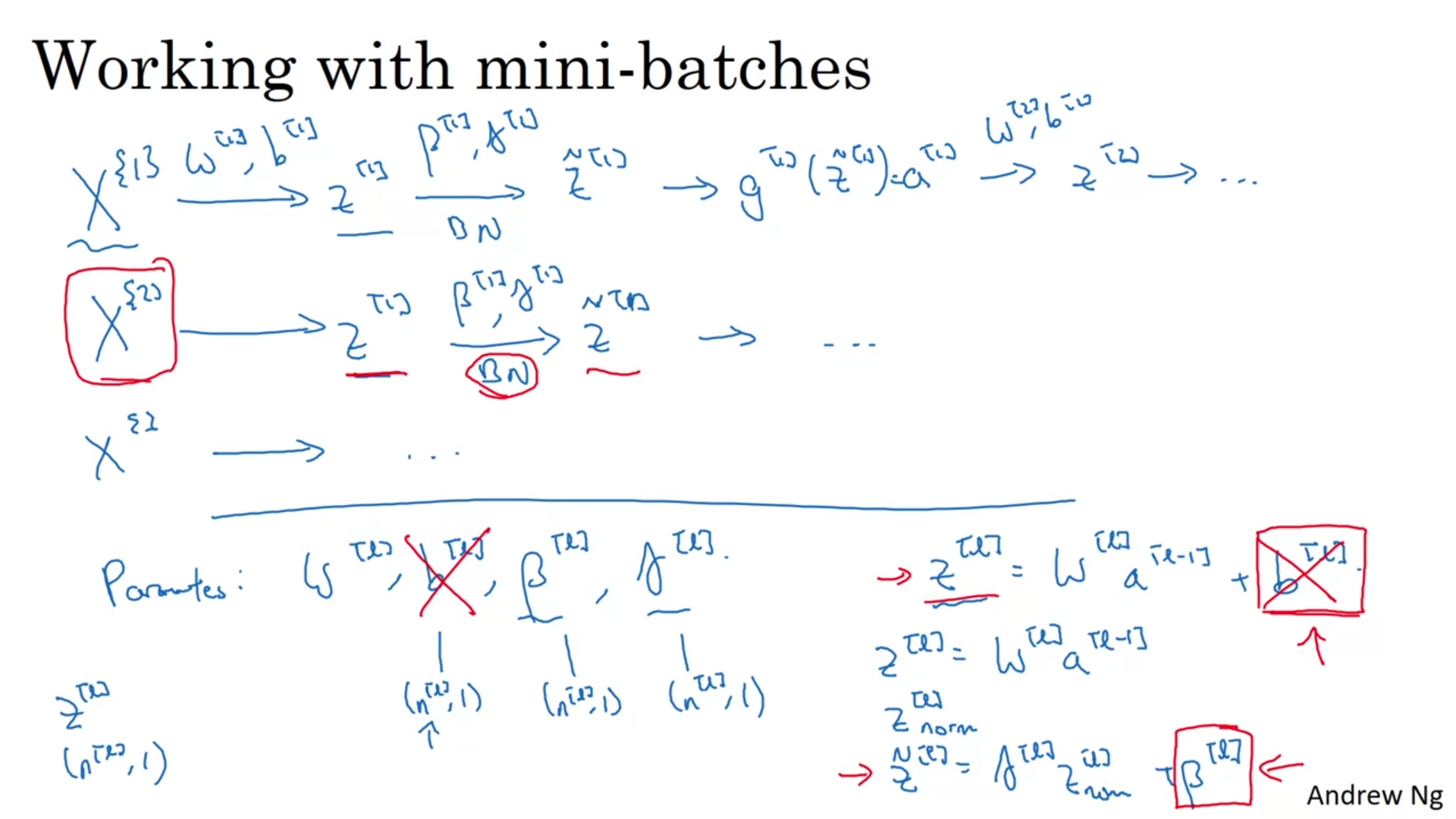 Because batch norm zeroes out the mean, if we use batch norm for hidden units, we dont need to learn b parameter. Instead beta parameter is enough