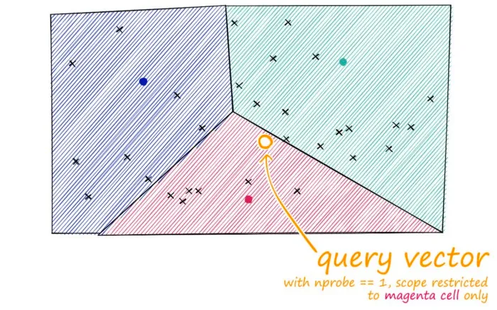 But there is a problem if our query vector lands near the edge of a cell — there’s a good chance that its closest other datapoint is contained within a neighboring cell. We call this the ==edge problem====: