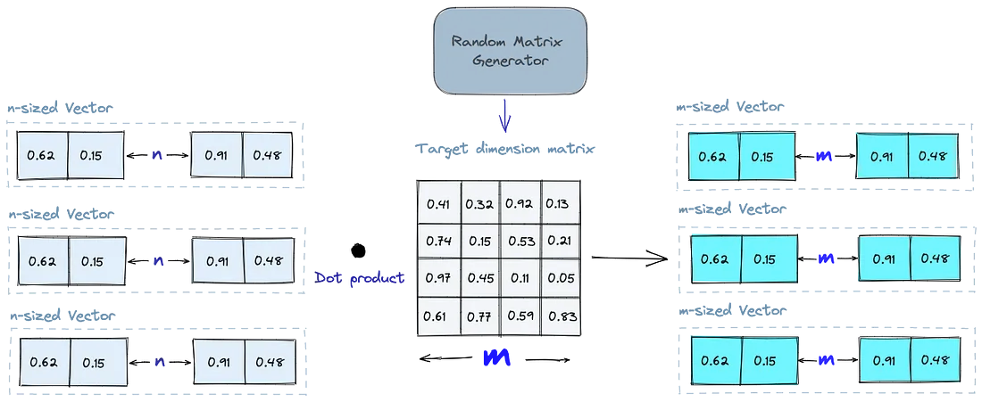The basic idea behind random projection is to project the high-dimensional vectors to a lower-dimensional space using a random projection matrix. When we query, we use the same projection matrix to project the query vector onto the lower-dimensional space. Then, we compare the projected query vector to the projected vectors in the database to find the nearest neighbors.
