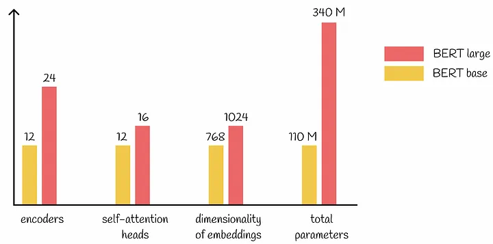 Model size differs: L : number of layers (transformer blocks) H : hidden size A : number self-attention heads base → L = 12, H = 768, A = 12, total-params: 110M large → L = 24, H = 1024, A = 16, total-params: 340M